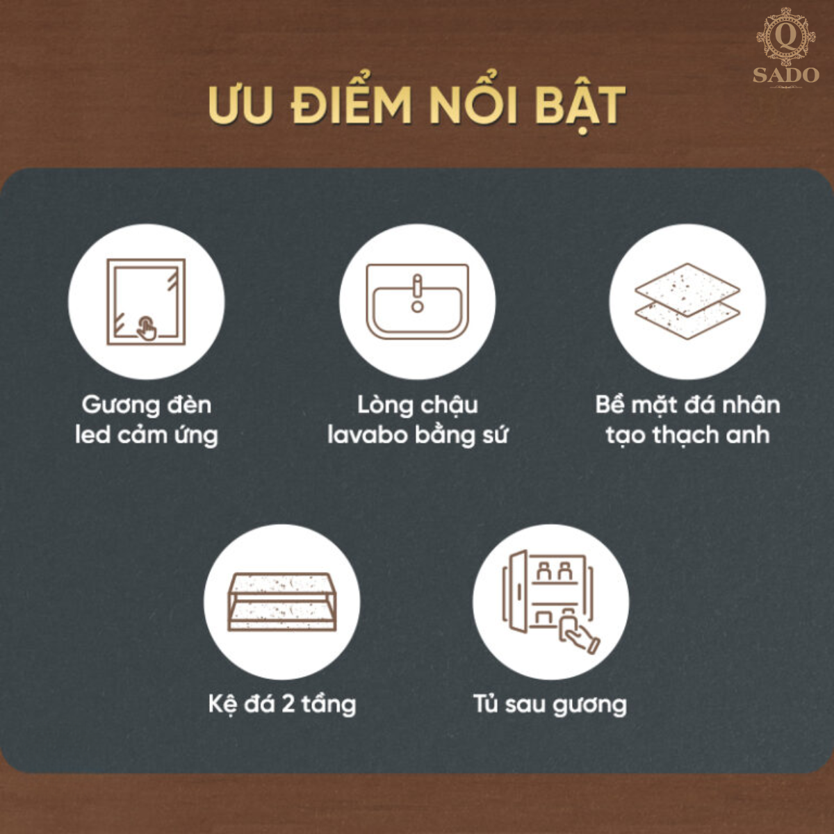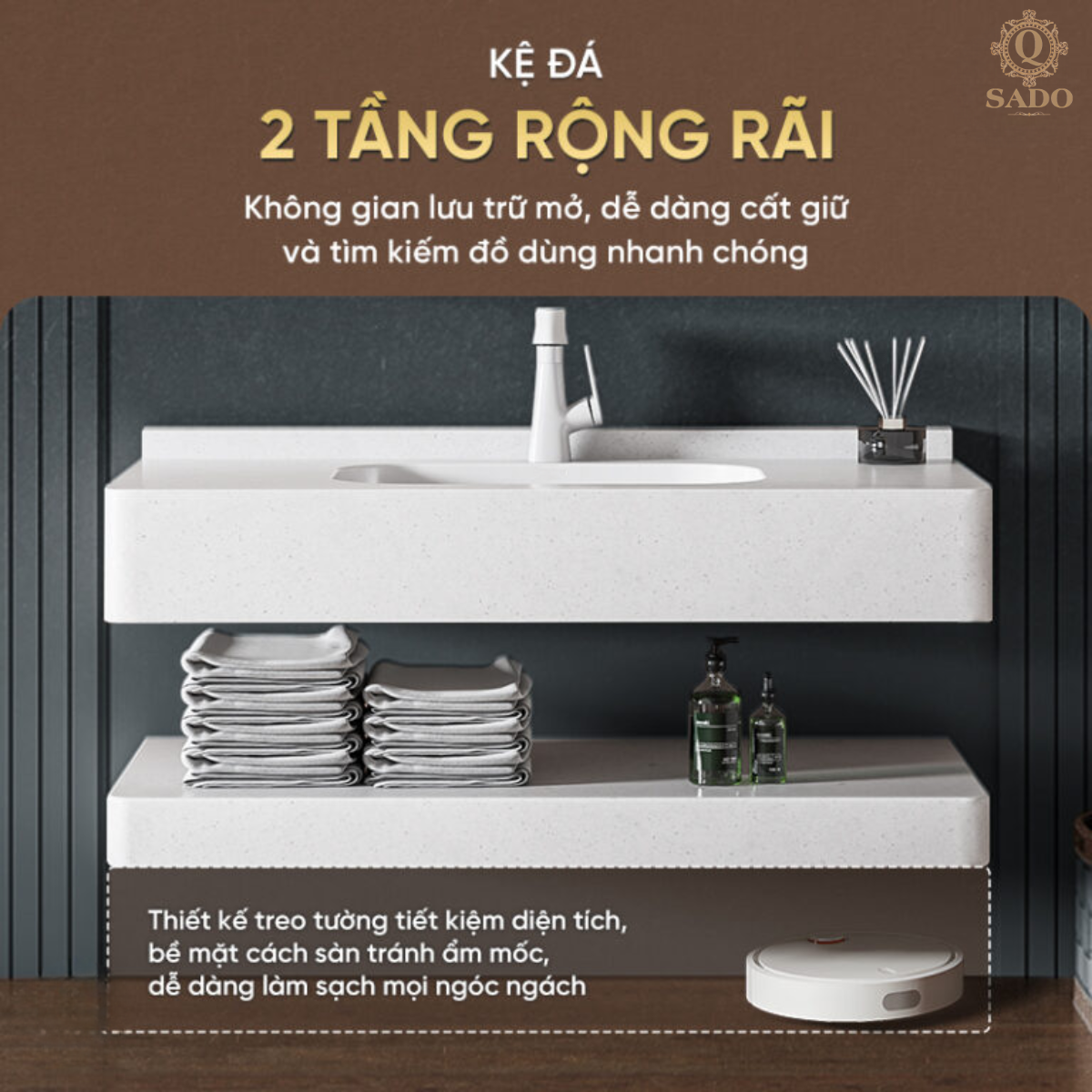 | Chất liệu lavabo | Bề mặt phiến đá nhân tạo thạch anh, lòng chậu gốm sứ sáng bóng |