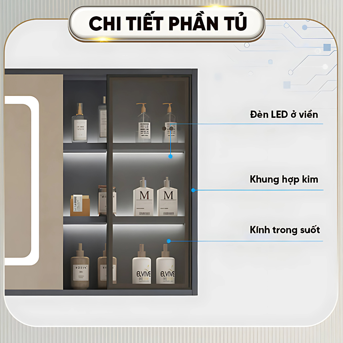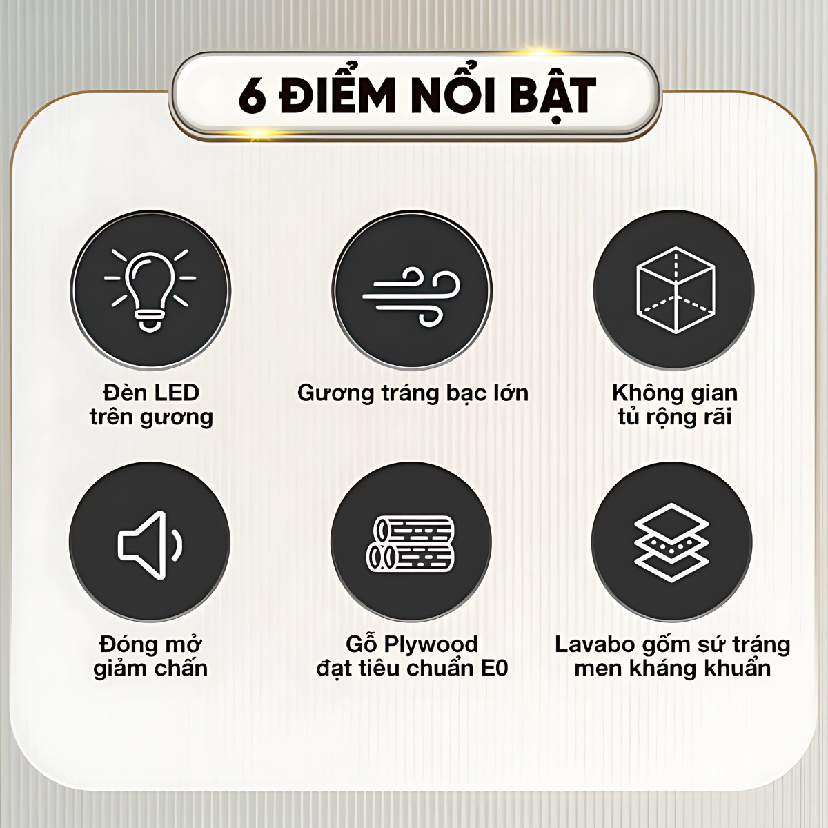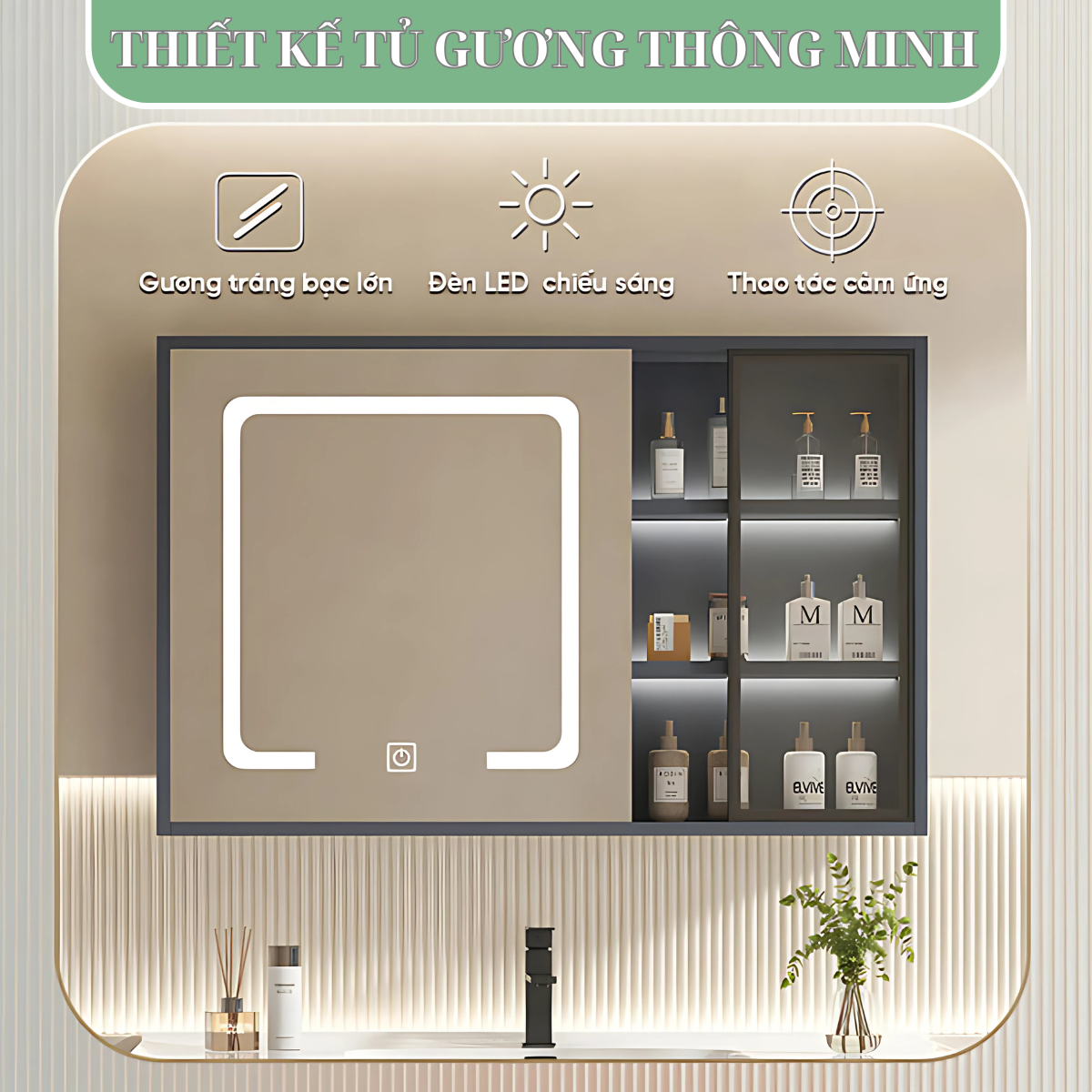 | Tiện ích gương | Cảm biến vuốt tay hiện đại; Đèn led chiếu sáng; Bản lề giảm chấn, thanh trượt mượt mà không gây tiếng ồn. |
