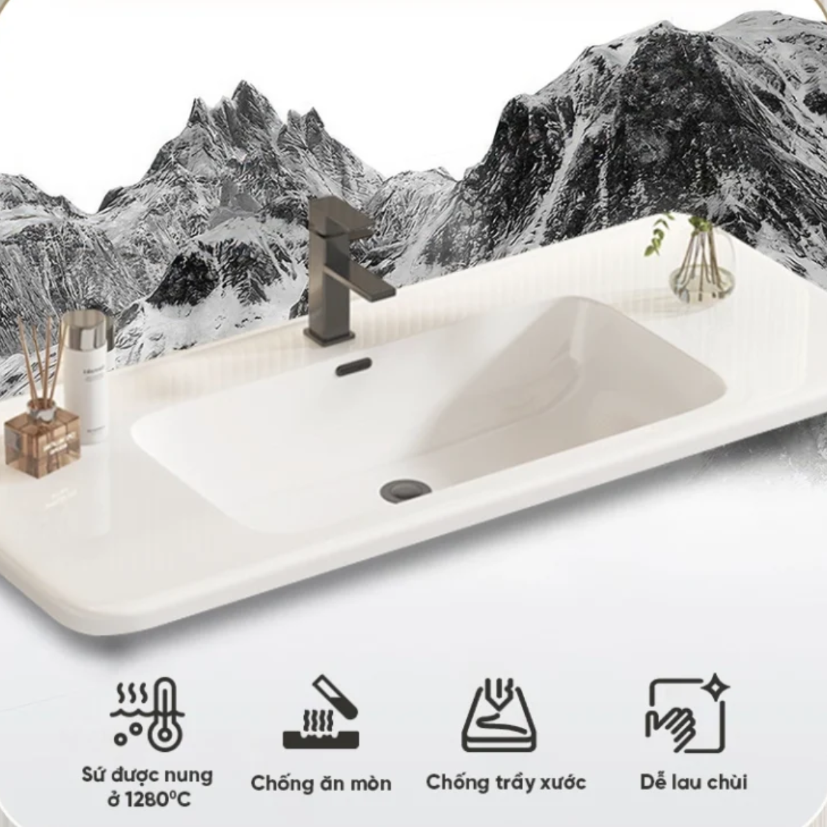 | Chất liệu lavabo | Gốm sứ, bề mặt tráng men Nano Bạc kháng khuẩn, chống ố vàng dễ vệ sinh |