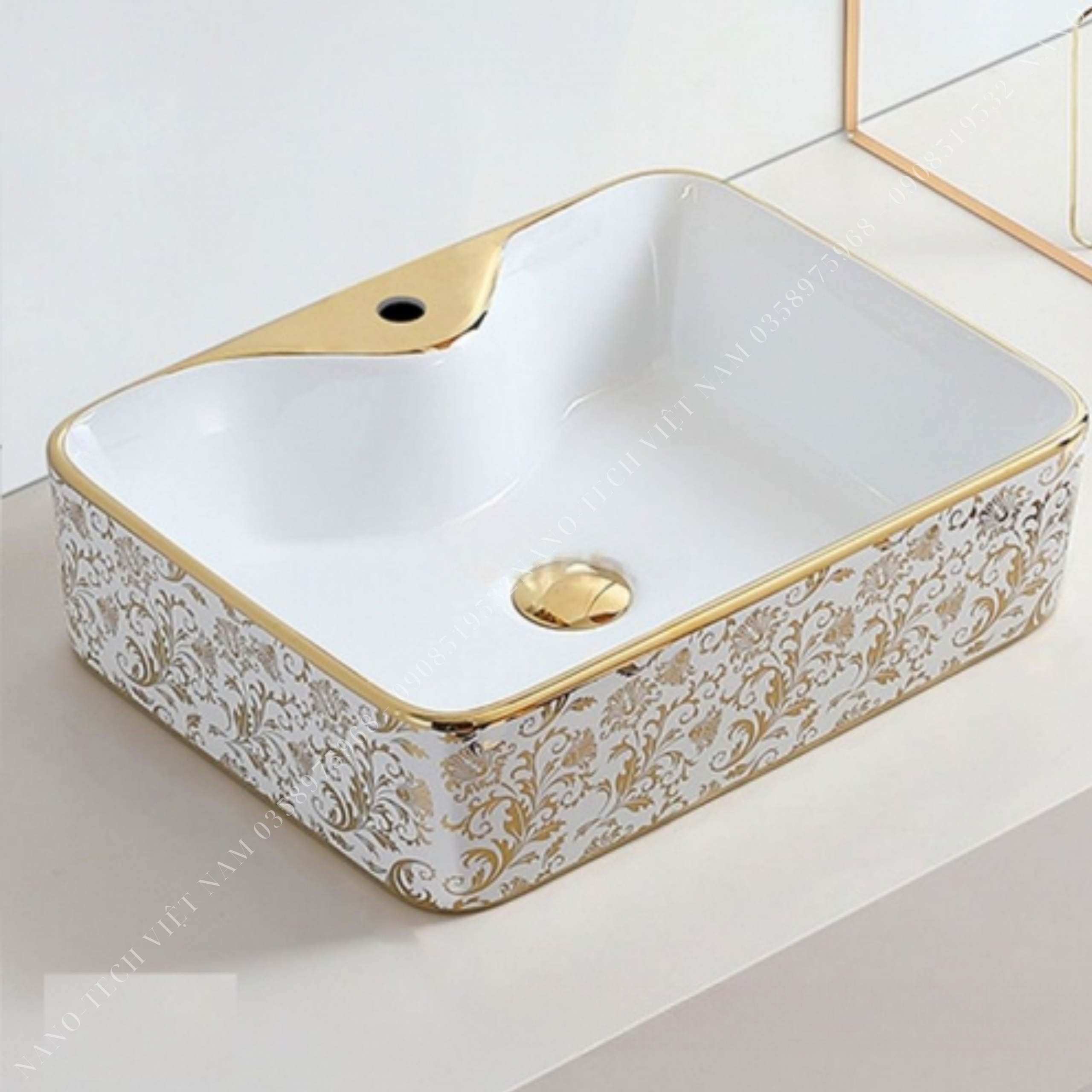 CHẬU LAVABO ĐẶT BÀN VUÔNG TRẮNG HOA VĂN VÀNG Q-SADO 8